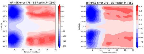 The difference in the zonal average RMSE of the CFSv2 and SE-ResNet models at different forecast lead times: (a) Z500 (units: m2 s−2), (b) T850 (units: K).