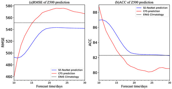We studied two indicators, RMSE and ACC, to evaluate the predictive performance of the model, and the results show that the SE-ResNet model is significantly better than the CFSv2 model in forecast lead times of 10–30 days. It is worth noting that the deep-learning model is not endowed with meteorological constraints internally, but we still try to analyze the interpretability of its prediction results. The difference between the CFSv2 model and SE-ResNet model mainly occurs in the extratropical region and is small in the tropical region. Moreover, the SE-ResNet model has good performance in the prediction of planetary waves with wavenumbers of 3–8 beyond 12 days, which also leads to the difference in the prediction performance of the models in the extratropical regions. As an issue to focus on, the variation characteristics of planetary waves are closely related to the occurrence and development process of weather. Not surprisingly, the data-driven model we developed in this study has a reliable reflection on the phase and propagation characteristics of planetary waves at forecast lead times of 11–30 day.