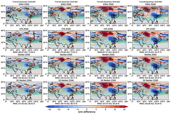 Comparison of the different models’ 500 hPa situation (units: gpm) of a cold wave weather process in Eurasia (2–8 December 2018) and the difference (units: K) of the ERA5 ground 2 m temperature between the schematic time and 06 UTC on 1 December 2018. Forecast lead time is 10 days, 12 days, 14 days and 16 days from left to right, respectively (Z500 is in contours, and T2m is in shading). The first row shows the Z500 and T2m of the ERA5 reanalysis data. The second row shows the CFSv2 prediction. The third row shows the ResNet prediction. The last row shows the SE-ResNet prediction.