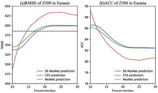 To evaluate the overall prediction effect of the different models in the Eurasian region, the average RMSE and ACC of the Z500 ISO components with the forecast lead times are shown in Figure 9. It can be inferred that the SE-ResNet model performs best in the overall prediction of upper-level circulation over the Eurasian region. The average RMSE and ACC of 10–30 days are 580.34 m2 s−2 and 83.78%, respectively. The ResNet model is slightly worse than the SE-ResNet model with a mean RMSE and ACC of 585.03 m2 s−2 and 83.51% for 10–30 days, respectively. The forecast skill of the CFSv2 model is worse than that of the deep-learning model beyond 13 days, and the average RMSE and ACC at 10–30 days are 603.85 m2 s−2 and 82.31%, respectively. Similar to the global prediction results, the RMSE and ACC predicted by CFSv2 show a large variation rate over 20 days, while it tends to be flat beyond that with a smaller decrease rate over time. We also notice that all the predictions over Eurasia are worse than the climatological forecast beyond 20 days. We think that it could be due to the atmospheric instability over the middle and high latitudes, as the Eurasia continent is a large piece of land with inconsistency in the characteristics of the underlying surface and atmospheric fluctuation is frequent over this region. Compared to the global prediction, where vast sea surface covers more than 70% of the underlying surface, having a relatively consistent characteristic, there will be more significant atmospheric variations over Eurasia.
