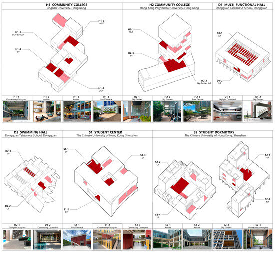 A total of 18 courtyards in 7 representative campus buildings of 4 contemporary campuses in the Lingnan area (namely, Lingnan University (Hong Kong), Hong Kong Polytechnic University (Hong Kong), Dongguan Taiwanese School (Dongguan), and The Chinese University of Hong Kong (Shenzhen)) were chosen as research subjects based on previous research on the thermal comfort of courtyards. In accordance with varying floor locations, the courtyards examined in this study were divided into five different types: connecting courtyard, atrium, roof terrace, sky garden, and skylight courtyard (Figure 1).