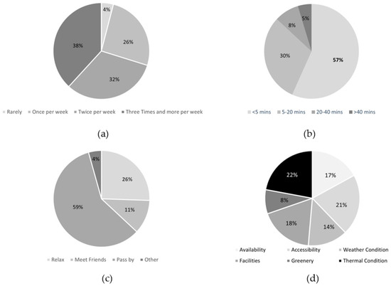 This study recorded the frequency, duration, purpose of visit, and environmental concerns of visitors (Figure 3). The frequency statistics (Figure 3a) showed that most visitors visited the courtyards three times per week on average (38%), followed by twice per week (32%), once per week (26%), and never (4%). The lower the floor on which the courtyards were located, and the more accessible they were, the higher the frequency of visits to them. In terms of duration (Figure 3b), the greatest proportion of visitors stayed for less than 5 min (57%), while 30% stayed for 5–20 min; those who stayed for more than 5 min typically visited courtyards that were adjacent to the building’s function area (e.g., print room) or had additional seating options, factors which evidently lengthened their stay. Regarding the purpose of visit (Figure 3c), 59% of visitors simply passed by the courtyard, 26% engaged in relaxing activities, and 11% met up with friends. According to statistics on tourists’ environmental concerns (Figure 3d), visitors were most concerned with the heat (22%), accessibility (21%), facilities (18%), and availability (17%), while in completely open courtyards, visitors were primarily worried about the weather.