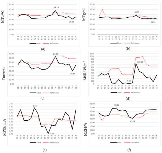 Figure 4 presents the findings of this study, which evaluated the thermal environment parameters (air temperature, black globe temperature, mean radiant temperature, solar radiation, wind speed, and relative humidity) of 18 chosen courtyards. According to the results of air temperature measurements, 88% of the courtyards had mean air temperatures that were lower than the reference group, and the mean air temperatures of the courtyards ranged from 31.34 °C (S2–3) to 38.35 °C (S1–1), with minor variations between courtyards (Figure 4a). According to the results of the black globe temperature measurements, in 89% of surveyed courtyards, the mean black globe temperature was lower than that of the reference group, and the mean maximum black globe temperature reached 48.26 °C (S1–1), with a maximum temperature differential of 10.57 °C (S2–3) (Figure 4b). The mean radiant temperature measurements revealed that 83.3% of the courtyards had lower mean radiant temperatures than the reference group, with a maximum mean radiant temperature of 63.47 °C (S1–1) and a minimum mean radiant temperature of 30.14 °C (S2–3), and with relatively large differences between courtyards (Figure 4c). The solar radiation measurements revealed that the mean solar radiation in the surveyed courtyards was lower than that of the reference group, ranging from 6.91 W/m2 (D2–1) to 738.68 W/m2 (S1–1), with significant variations between courtyards (Figure 4d). Regarding the wind speed, 61.1% of the courtyards had lower mean wind speeds than the reference group, with mean wind speed intervals ranging from 0.02 m/s (D2–1) to 1.73 m/s (H2–2) (Figure 4e). Finally, the relative humidity measurements revealed that, on average, 66.7% of the courtyards had greater relative humidity levels than the reference group, with the range of mean relative humidity readings falling between 41.23% (D2–2) and 68.22% (H2–2) (Figure 4f).