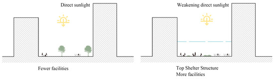 Figure 6. Adding shading elements to weaken the western sun. - Strategy 4: Select appropriate aspect ratios and landscape features to obtain appropriate sky visibility. When designing a courtyard, it is possible to choose an appropriate high-width ratio of the space, take advantage of the blocking effect, and reduce solar radiation to improve thermal comfort. Moreover, the surrounding environment can facilitate a certain amount of shadowing, for example, selecting native trees with a single umbrella canopy to optimize yard enhancement [38]. By establishing a microclimate, the courtyard can better regulate its own temperature and thereby improve the crowd’s experience in the space (Figure 7). Based on the findings regarding visitor behavior, this study suggests that to maximize usage of the space, the courtyard design should focus on the accessibility of courtyards and provide an appropriate number of seats.