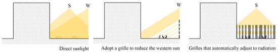 Figure 5. Adding skylight canopy to weaken solar radiation. - Strategy 3: Courtyard designs consider adding shading elements to diminish the effects of western exposure. Regarding courtyard orientation, west-oriented courtyards exhibited particularly poor thermal comfort. Under most circumstances, changing the orientation of the courtyards would not be practical; therefore, it is advised to reduce the negative effects of sunburn components by increasing the photovoltaic gradient in the western direction and thereby minimizing the impact of sunlight (Figure 6). Wang Yu et al. [36] proposed a sustainable retrofit idea from the perspective of integration with photovoltaic panels to reduce the impact of western sun exposure while realizing the conversion and utilization of energy by means of laying an opaque over-water panel system on the western sun exposure surface. Zheng Shenhong et al. [37] realized more efficient shading by improving the push bar shading system by using the push bar drive motor combined with sensors to automatically adjust the push bar angle according to the sun’s position and heat.