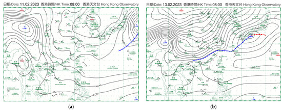 Surface isobaric chart for 8 a.m. local time, Hong Kong (UTC + 8), on (a) 11 February 2023 and (b) 13 February 2023. Blue line refers to the position of cold front. Red line refers to the position of warm front.
