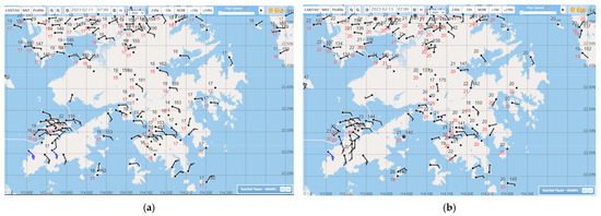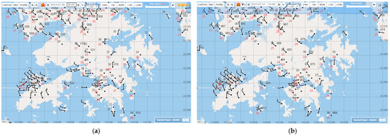 The surface observations in Hong Kong at 7 a.m. local time on (a) 11 February 2023 and (b) 13 February 2023.