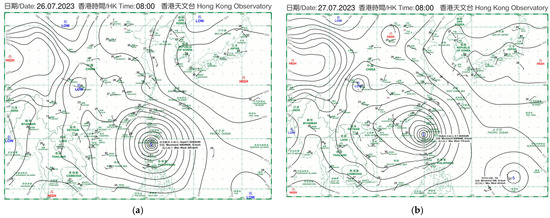 A synoptic weather chart covering Hong Kong and South China is published by the HKO every 6 h. Synoptic weather systems such as fronts and tropical cyclones can also be observed on the weather chart. Data can be accessed directly from the HKO’s website (https://www.hko.gov.hk/en/wxinfo/currwx/wxcht.htm (accessed on 1 August 2023)).