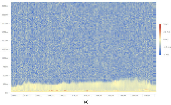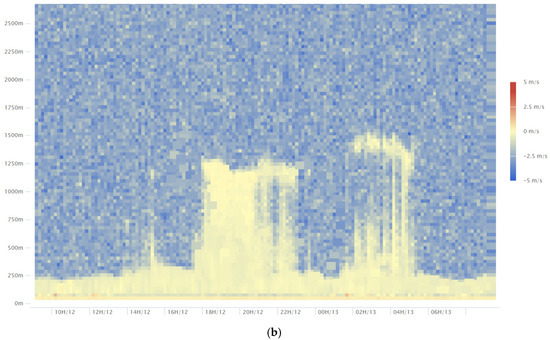 Vertical velocity data (time–height cross-section) for Doppler LiDAR at King’s Park, Hong Kong were examined in the present section. For the first case in Figure 5, due to the low cloud cover, the measurement range of the LiDAR in the vertical was very much limited, mostly on the order of 200 to 300 m above ground. Figure 5a shows that the vertical velocity was mostly negative over the whole study period for this case, reaching about 1 to 2 m/s downward. This is the first time that downward vertical motion has been confirmed and documented during foggy weather in Hong Kong. The subsidence helped suppress vertical motion of the air, and thus the foggy conditions persisted over the waters of Hong Kong, making the fog rather hard to disperse. The vertical velocity data from LiDAR could be helpful to weather forecasters in monitoring low visibility weather.