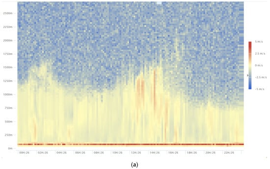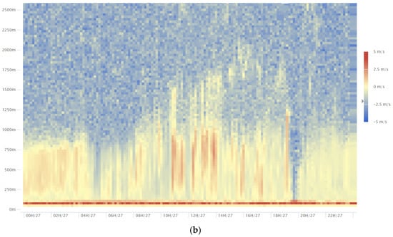 In the second case, the vertical motion was a little bit trickier. On the first day (Figure 6a), during the daytime, downward motion of 1 to 2 m/s was mostly observed below 700 m or so. There could have been sometimes during the day when upward vertical motion was detected by the LiDAR above that height, but the mostly downward motion within the atmospheric boundary layer appeared to confirm that subsidence was conducive to the heating up of the surface layer air, thus achieving a higher surface temperature during the day, at least for the conditions on 26 July 2023.