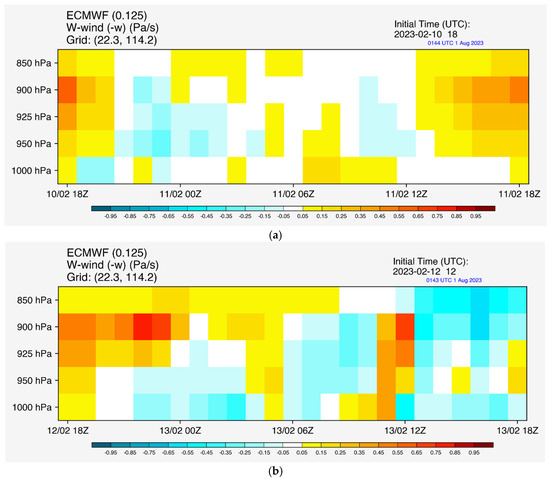 Vertical velocity (negative omega in Pa/s) at a grid point near King’s Park, Hong Kong for (a) 11 February 2023 and (b) 13 February 2023. Warm colours indicate updrafts and cool colours indicate downdrafts. The times are in UTC (UTC + 8).