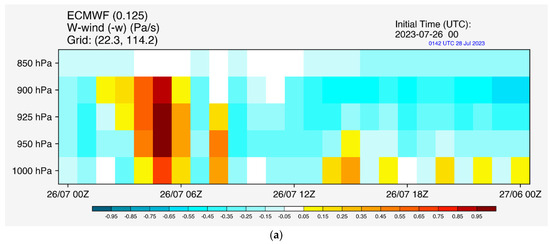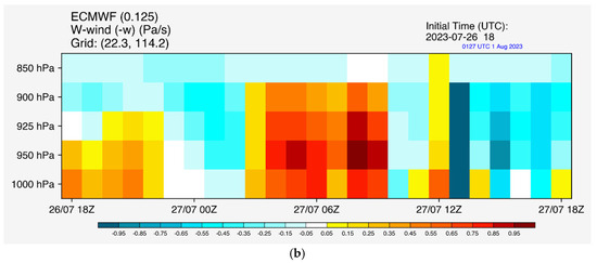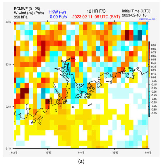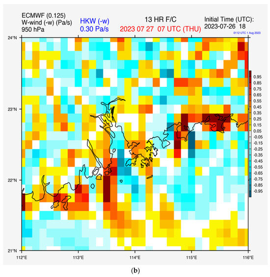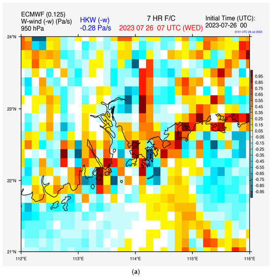 For the second case, on the first day (26 July 2023, Figure 9a), downward motion was forecast to occur for a while during the day at King’s Park, though the vertical motion was mostly updrafts in the earlier part of the day. It appears that, within the model, the heating of the surface air during the earlier part of the day might not have arisen mostly from subsidence in the atmospheric boundary layer. For the second day (27 July 2023, Figure 9b), the vertical motion was basically updrafts during the whole daytime period within the atmospheric boundary layer. Subsidence does not appear to be the major reason for the forecast occurrence of extremely hot weather. The 950 hPa vertical velocity in the region around Hong Kong is shown in Figure 10. In general, it is hard to discover a pattern of the horizontal distribution of vertical velocity in the daytime. It appears that updrafts may mostly occur along the coast. In inland areas, the pattern is basically a mixture of both updraft and downdraft. Thus, the model forecast may be more consistent with the vertical motion expected from a heated surface, without a clearly identifiable pattern.