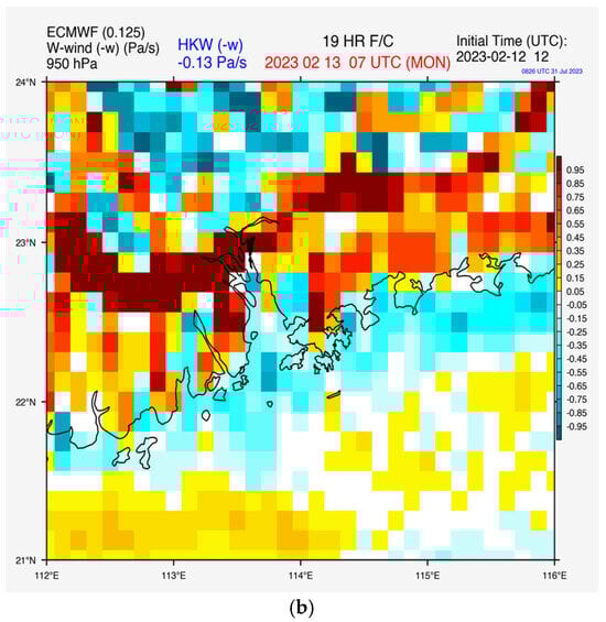 With the availability of the vertical motion data from the Doppler LiDAR as the basis, we extended the study further by considering the capability of a global NWP model in capturing vertical motion on a synoptic scale. The time–height cross-section of ECMWF vertical velocity data at the location near King’s Park, Hong Kong for the first case is shown in Figure 7. In the foggy weather case, the vertical motion was forecast to be mostly downward at this location, including the daytime period, which is consistent with the Doppler LiDAR observations. In particular, the horizontal distribution of vertical motion at 950 hPa is shown in Figure 8. Downward motion has been mostly forecast along the coast, particularly for the lighter wind day of 13 February 2023. This is consistent with the occurrence of widespread fog along the coast of southern China.
