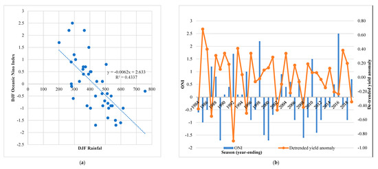 (a) DJF rainfall vs. DJF Oceanic Nino Index (ONI) and (b) ONI and detrended yield.