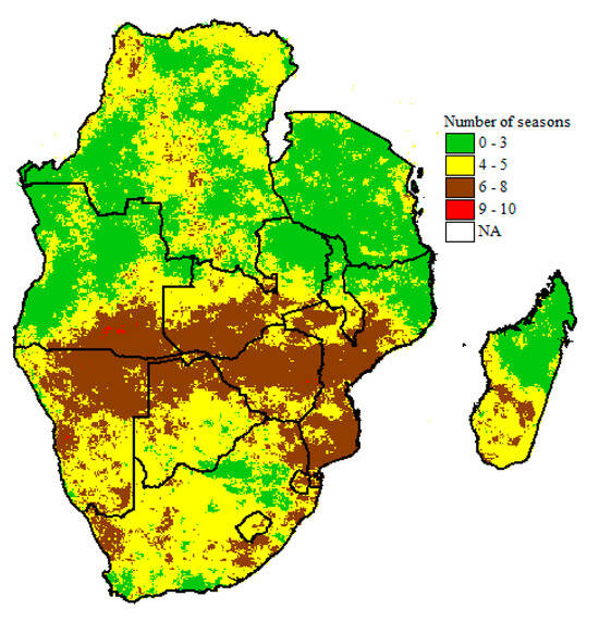 Figure 1b highlights the five strongest El Niño events in the past 40 years. Three of these five El Niño seasons—1982/83, 1991/92, and 2015/16—corresponded with severe and widespread agricultural droughts across Zimbabwe, while a fourth season, 2009/10, resulted in a drought in the southern and eastern parts of Zimbabwe [9,16]. The fifth El Niño season did not result in the widespread dry conditions in Zimbabwe that are typically observed following El Niño events (Table S1). This was due to an unusual state of regional climate drivers that year, including an abnormally strong Angola low, very high sea surface temperatures near southern Africa, and abnormal regional wind patterns [1,21,22].