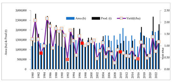 El Niño years (red points) and historical maize production from 1980–2023 in Zimbabwe.