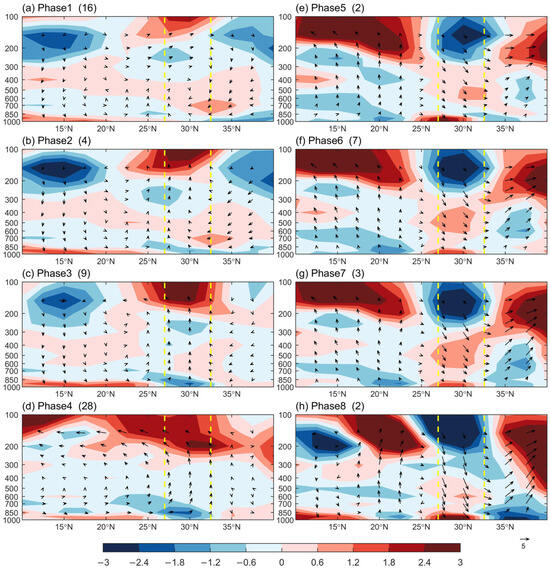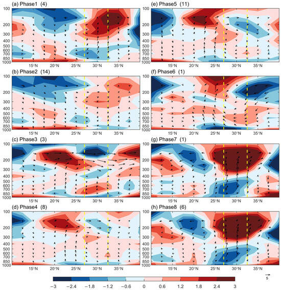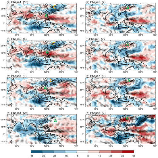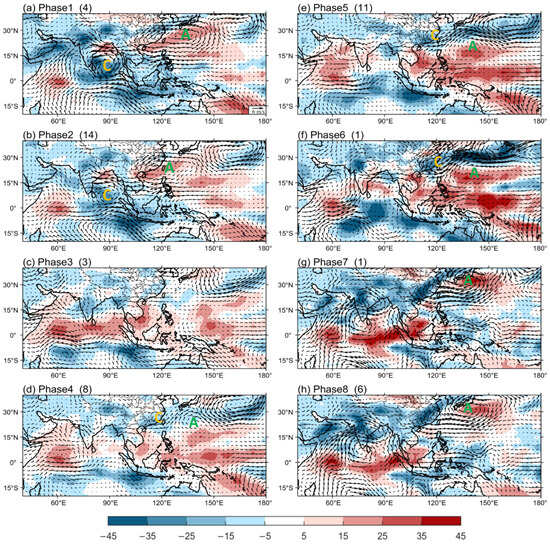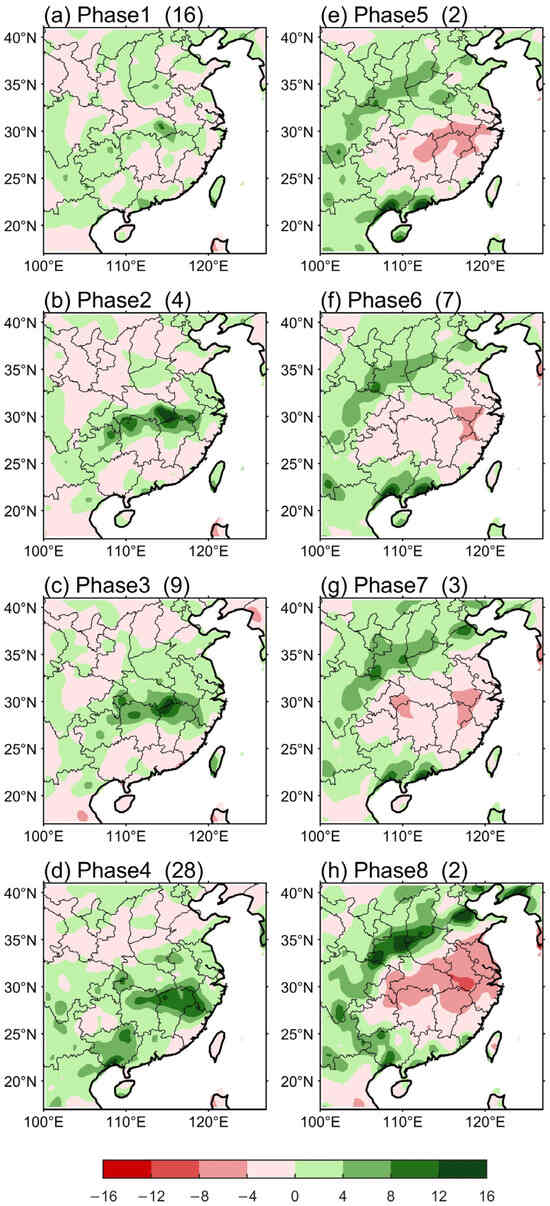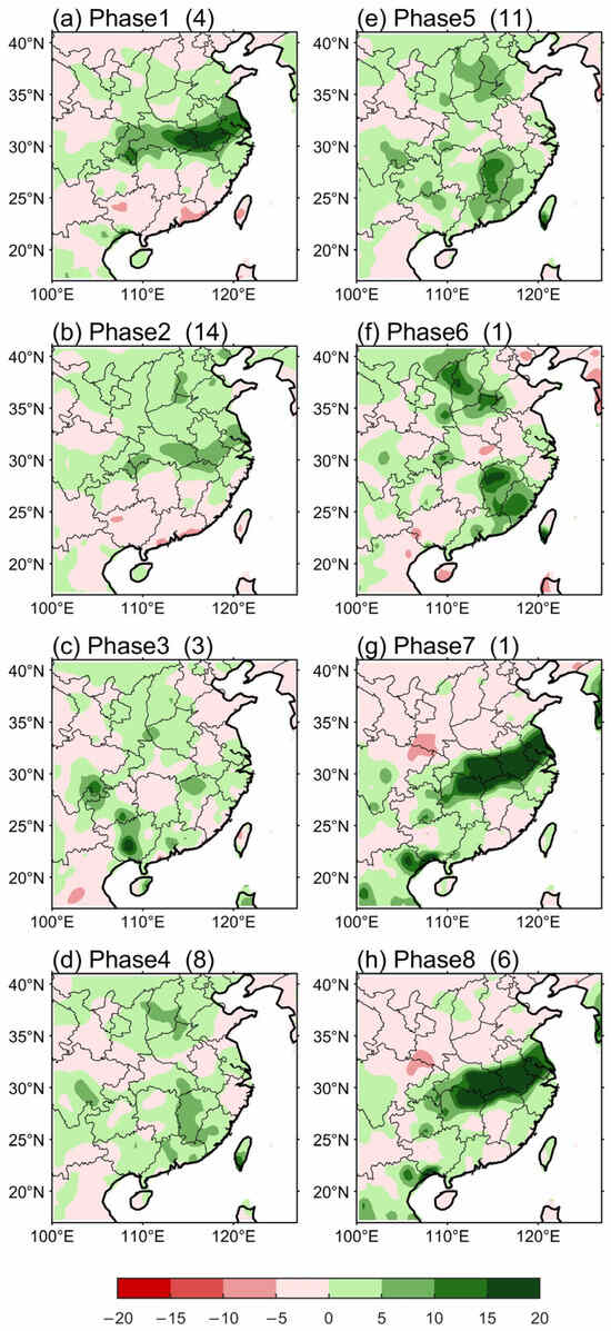 3.3.2. Impact of BSISO2 on Yangtze Rainfall in Eight Phases