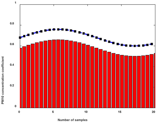 Statistical distribution of PM10 concentration limits at various levels. The red bars represent the number of examples, the black line represents the concentration of PM, and the black block just highlights the black line and has no real meaning.