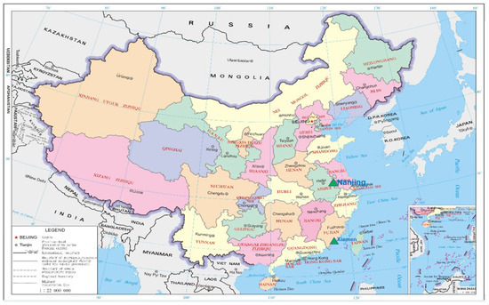 Cities A and B in China are Nanjing and Xiamen, respectively, with annual average PM10 values of 0.174 and 0.13, representing moderately polluted and mildly polluted PM10. Xiamen is a coastal city located on the southeastern coast of Fujian Province, China, and Nanjing is the capital city of Jiangsu Province, China, located in the eastern part of Jiangsu Province on the southern bank of the lower reaches of the Yangtze River (Figure 4).