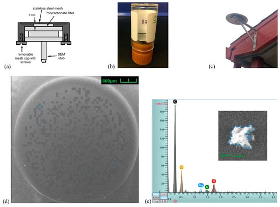 (a) Schematic of passive PM sampler. (b) Shipping vial. (c) Outdoor weather shelter. (d) CCSEM-EDS overview image showing random field selection (small dark squares) and detected particles (blue dots). (e) Example of individual particle record including EDS data.
