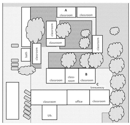 Sampling map of the school site showing A and B indoor classroom locations and outdoor sampling location C.