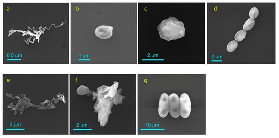 The presence of biogenic spore particles in these samples is not unusual for indoor and outdoor environments and is consistent with other studies that have identified particle types in air samples (e.g., [,]). Spores and pollen grains may be further identified at the genus level—or in some cases, species or group levels—and may be useful for epidemiology studies targeting allergy and asthma [].