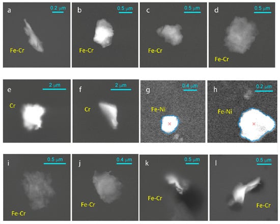 Fine metal particles. (a–h) Classroom A, week 1. (i,j) Flat particles in Classroom B, week 1. (k) Fragment in Classroom A, week 2. (l) Fragment in blank sample.