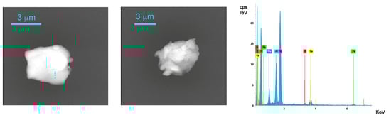 The number of particles analyzed via CCSEM-EDS ranged from 200 to 1000 particles per passive sample. Observed particle sizes, morphology, and CCSEM-EDS chemical types are shown in Figure 3, Figure 4, Figure 5, Figure 6, Figure 7, Figure 8 and Figure 9. Together, these data suggest five major airborne particle types: (a) fine, carbonaceous combustion agglomerates, 20 nm–10 μm w/20–200 nm primaries (Figure 3); (b) coarse, biogenic, carbonaceous particles, 1–10 μm (Figure 4); (c) fine iron (Fe)-, chromium (Cr)-, and nickel (Ni)-rich particles, 250 nm–2 μm (Figure 5); (d) predominantly coarse, aluminosilicate soil, dust, and crustal particles, 1–10 μm (Figure 6); and (e) sodium (Na) salt fog particles with associated calcium (Ca), sulfur (S), and/or chlorine (Cl), 200 nm–6 μm (Figure 7).
