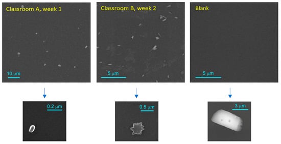 Low magnification SEM images showing clusters of submicron, Na (S, Cl, and Ca) salt particles in samples from Classroom A, week 1, and Classroom B, week 2, but absent from blank. Magnified examples of individual particles from each sample are shown in the second row, along with an extremely rare, 5 μm S-Cl particle from a blank sample average.