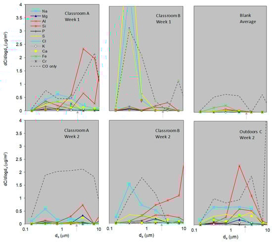 Elemental size distributions (size bin-normalized mass concentrations (μg/m3) vs. aerodynamic diameter (μm)) calculated for all sampling locations and blank average. Primarily carbonaceous particles are also included and denoted “CO only”. The arrows on the X axes denote 2.5 μm.
