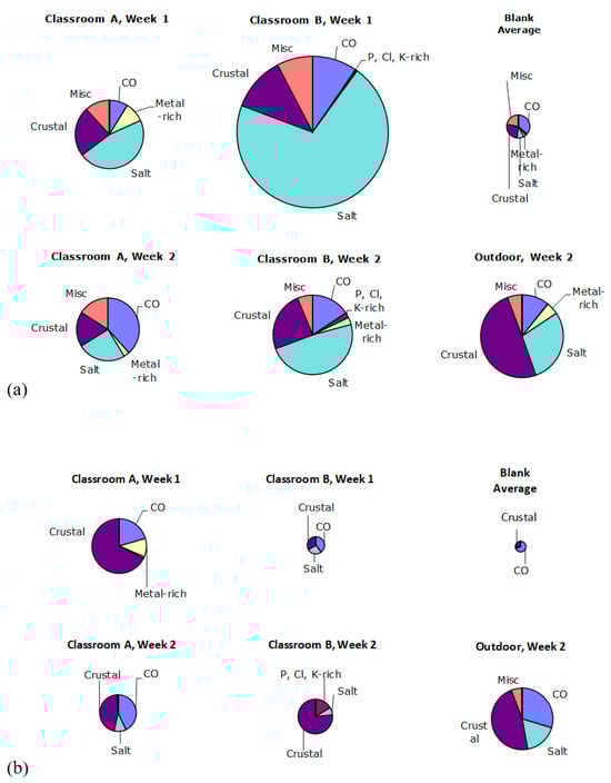 Percentage of chemical types per sample by mass for (a) PM2.5 and (b) PM10–2.5. The size of each pie chart is scaled by the non-blank-corrected mass concentration. See Appendix A for particle type definitions.