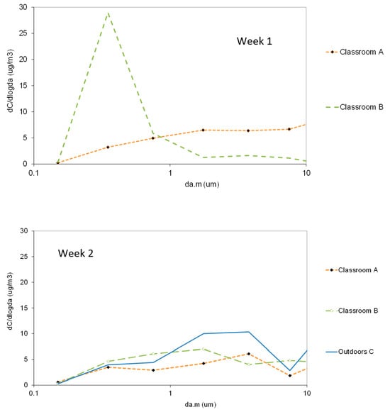 PM size distributions (size bin-normalized mass concentrations (μg/m3) vs. aerodynamic diameter (μm)) for outdoor Week 2 and both classrooms during Weeks 1 and 2.