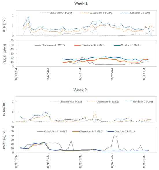 Two-day averages and trends for the hourly PM2.5 sensor data are presented in Table 1 and Figure 11, respectively. Passive PM2.5, sensor PM2.5, and continuous sensor BC all show similar trends of lower values in Classroom A vs. B, and Week 2 vs. 1. The exception was Classroom A during Week 2, for which PM2.5 sensor data showed the highest average concentration and several prominent peaks. These excursions were not observed in the BC sensor, suggesting either non-BC PM2.5 composition, PM2.5 variation within the classroom, or PM2.5 sensor malfunction.