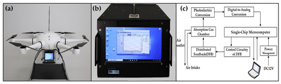 Figure 2. (a) The self-developed CH4 detector is installed on the UAV for aerial monitoring of a natural gas purification plant in Sichuan Province, China. (b) The self-developed CH4 detector (c) The internal working principle of the CH4 detector.