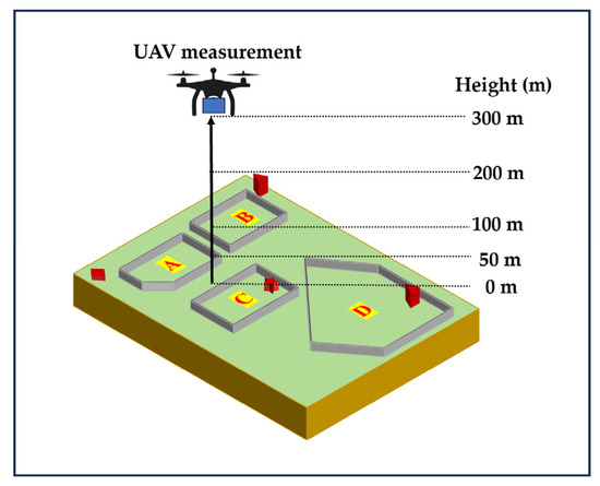 To study the vertical distribution of CH4 at different times, we carried out vertical flight experiments at 9:00, 11:00, 13:00, 15:00, 17:00 and 19:00 local time (LT), respectively, in April 2023. According to Figure 3, in each vertical flight, the UAV raised vertically to 300 m AGL and hovered for 1 min (min), then began to descend, hovering for 1 min at the heights of 200, 100 and 50 m AGL, respectively, and returning to the ground. According to Figure 1, the position of vertical flight is between area A and area C, which is indicated by a green five-pointed star.