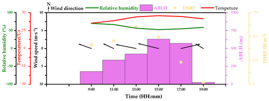 The experimenter controlled the UAV equipped with CH4 detector to conduct detection around area A and area C at the speed of 1 m/s, respectively. The heights were determined to be 30 m and 60 m AGL, which can cover the potential leakage area to the greatest extent. When setting the detected height, the following factors should be considered: detected target, safe distance (stay away from natural gas equipment and pipelines) and environmental factors (such as meteorology, wind speed, airflow, etc.). The meteorological factors during the experiment are shown in Figure 4. ABLH is the abbreviation for atmospheric boundary layer height. According to the downward shortwave radiation flux (DSRF) and the wind speed, the PS classification was determined [21].