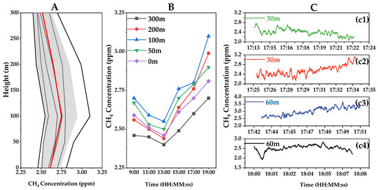 Figure 5. (A) The vertical profiles of CH4 concentrations at different times. The black line represents the concentration changes of a single vertical observation, the red line is the mean value and the shaded areas are the standard deviations. (B) Diurnal variation of CH4 concentration at different heights. (C) The UAV equipped with CH4 detector hovered over the natural gas purification plant on 13 April 2023. (c1,c2) represent the first and second horizontal measurement of CH4 at 30 m AGL respectively. (c3,c4) represent the first and second horizontal measurement of CH4 at 60 m AGL respectively.