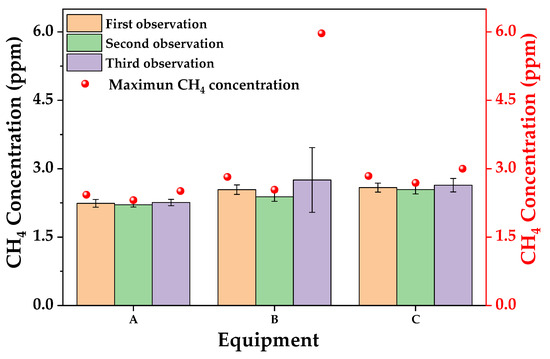 The CH4 concentration of chimneys and flares in the natural gas purification plant is shown in Figure 5. The CH4 concentrations at the discharge ports of the chimney (A) and torches (B and C) were 2.24 ± 0.03, 2.60 ± 0.35 and 2.59 ± 0.03 ppm respectively. The CH4 concentration of the two torches was higher than that of the chimney. In the third observation of torch B, it was found that the CH4 concentration increased obviously, reaching a maximum of 5.97 ppm, indicating that there was a leak. Compared with torch B, the change of CH4 concentration in torch C was relatively stable.