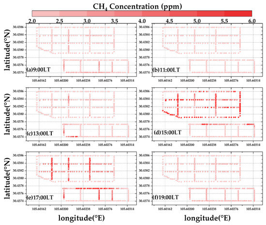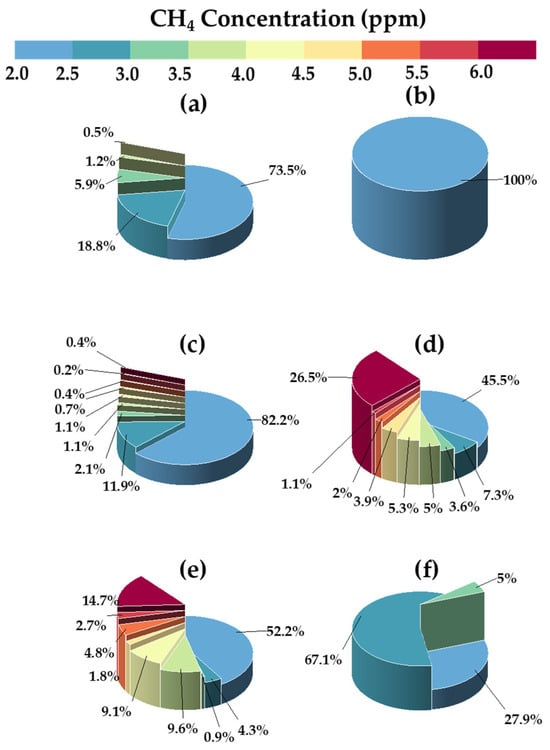 Figure 8. Proportion of CH4 concentration range in mobile observation. The time from (af) corresponds to Figure 7.