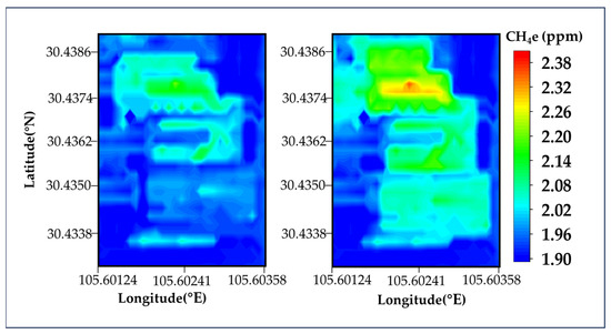Figure 9. Background CH4 enhancement (CH4e) spatially interpolated on 30 m AGL (left panel) and 60 m AGL (right panel) of UAV flight (in units of ppm as per color scale).