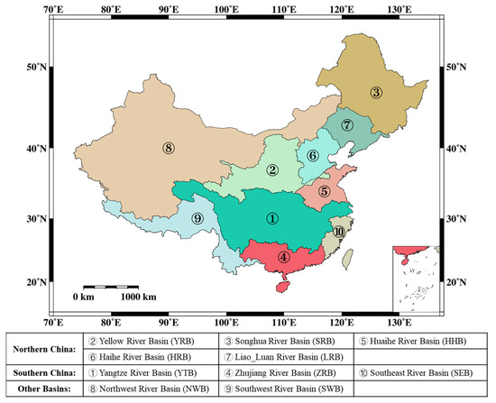 China’s vast geographical expanse exhibits diverse climatic characteristics. Average annual precipitation exhibits a spatial distribution that contrasts with elevation, ranging from 8 to 2450 mm [36]. As altitude decreases, mean annual temperatures rise from −4 to 20 °C, and evapotranspiration varies across the country, peaking in the southeast at 1400 mm and dropping to a minimum in the northwest at 18 mm [37]. While China enjoys relatively abundant total water resources, the availability of terrestrial water storage (TWS) varies significantly across regions, as does the vulnerability to extreme weather events. In this study, the country’s waters are categorized into ten major river basins according to the China’s zoning principle for water resources (http://www.chinawater.com.cn/, accessed on 15 October 2022), as depicted in Figure 1.