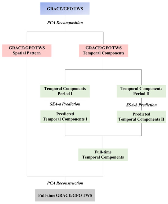 The procedure of filling the data gap using SSA-PCA. Period I denote the period of missing data in GRACE missions, and period II is the period of missing data after GRACE missions.