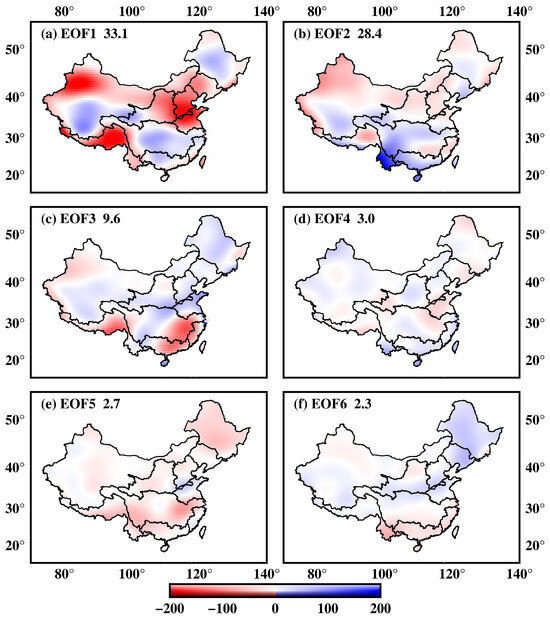 The spatial patterns and temporal components obtained from the PCA decomposition are depicted in Figure 3 and Figure 4, focusing on the first six modes. EOF1, which accounts for 33.1% of the explained variance, exhibits a pattern that closely resembles the overall trend of GRACE/GFO TWS, albeit with some seasonal signals embedded within PC1. Modes 2 (28.4%) and 3 (9.6%) predominantly capture the seasonal variations inherent in the original data, while modes 4, 5, and 6 serve as residual components contributing to the reconstruction of missing data. Employing the SSA-PCA algorithm, this process culminates in the generation of a comprehensive and continuous TWS dataset spanning from April 2004 to March 2023.