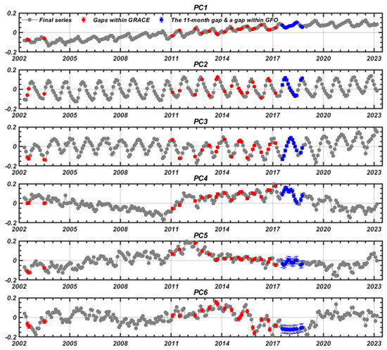The first 6 principal components (PCs) resulting from the PCA decomposition. The gray dot line represents the original components, the red line indicates the temporal components I during the GRACE period by SSA-a, and the blue line illustrates the temporal components II after the GRACE period by SSA-b.