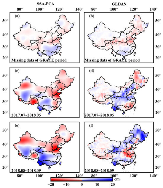 Comparisons of the filled data by SSA-PCA and the results of GLDAS at GRACE missions (a,b), July 2017–May 2018 (c,d), August 2018–September 2018 (e,f).