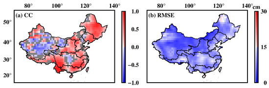 (a) Correlation coefficient (CC) and (b) root-mean-square error (RMSE) between the filled data obtained through SSA-PCA and the corresponding results from GLDAS, spanning the entire period of missing data. The gray-shaded region indicates cases where the CC values do not meet the 95% confidence threshold.