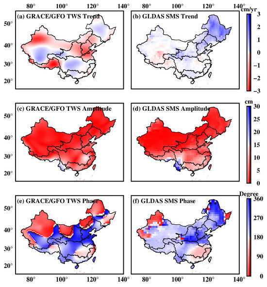 Spatial distribution of the (a) GRACE/GFO TWS trend, (b) GLDAS SMS trend, (c) GRACE/GFO TWS annual amplitude, (d) GLDAS SMS annual amplitude, (e) GRACE/GFO TWS annual phase, and (f) GLDAS SMS annual phase across mainland China.