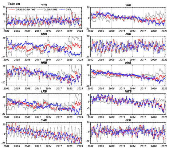 Temporal variations in water storage in ten main basins over mainland China; the red line represents the time series of GRACE/GFO TWS, the gray line corresponds to GLDAS SMS, and the blue line depicts GWS.