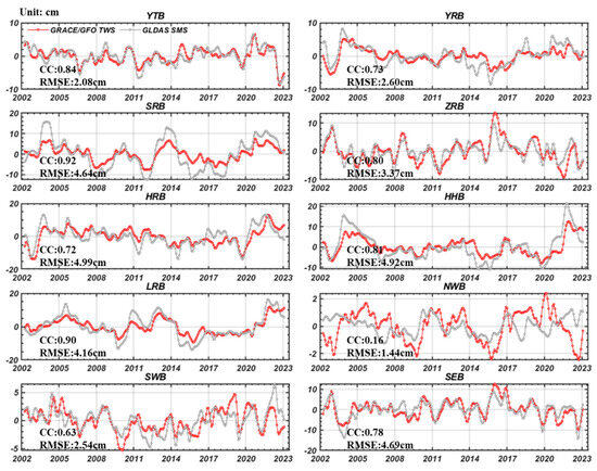 Interannual variations in water storage in ten main basins over mainland China; the red line represents the time series of GRACE/GFO TWS, and the gray line corresponds to GLDAS SMS.