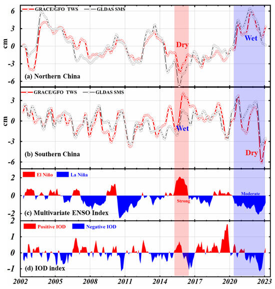 Interannual timeseries of GRACE/GFO TWS and GLDAS SMS in northern (a) and southern (b) China. Parts (c,d) are the multivariate ENSO index and IOD index, respectively.